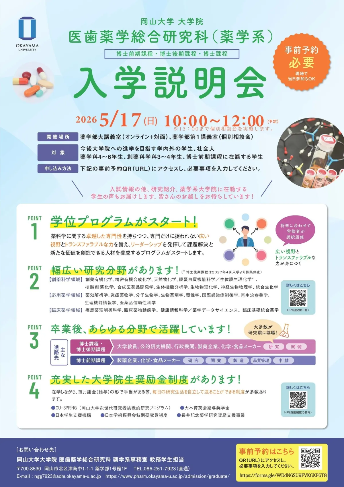 Okayama University will host an admission briefing for the Graduate School of Medical, Dental and Pharmaceutical Sciences on Sunday, May 17, 2026. This event aims to inform prospective students about the educational and research programs available in the Pharmacy Division of this comprehensive research school. Participants will gain insights into the various educational programs, scholarship opportunities, and entrance exam details.