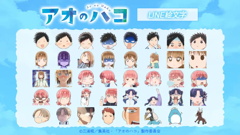 In a thrilling development for fans of the animated series, Aonohako, a line of official LINE stickers has been launched. This initiative is spearheaded by Creative Plus, a subsidiary of M-up Holdings, located in Shibuya, Tokyo. The set includes 40 emoji-style stickers that perfectly capture the essence and charm of the beloved characters from the show. Each sticker is available for purchase at a price of 100 coins or 250 yen.