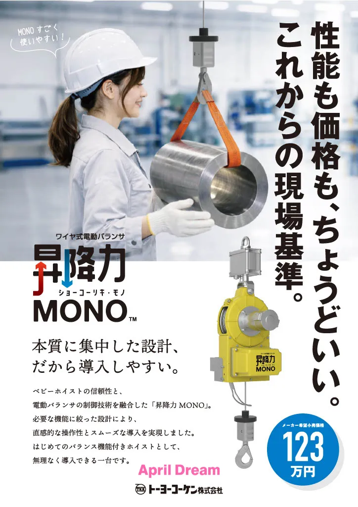 The realm of manufacturing is on the brink of a significant transformation with the introduction of the electric balancer "ShoRikiryoku MONO". This innovative device merges the strengths of hoists and balancers, providing users with an unprecedented experience of handling heavy workloads with ease. Launching at a price of 1.23 million yen on April 1, this product not only showcases cutting-edge technology but also embodies the dream of Toyokoken Corporation, which aligns with the spirit of April Dream, a day dedicated to sharing aspirations.