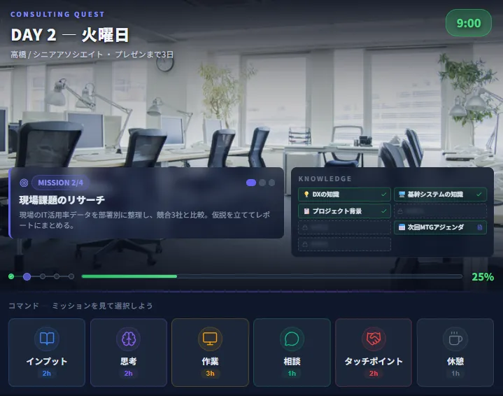 Senior Associate with one month of experience on a digital transformation project. Through interactions with managers, colleagues, and clients, players will navigate tasks that replicate real consulting work, including information gathering, hypothesis development, and preparation of presentation materials. At the end of the game, players receive feedback on their performance ranked from S to D.