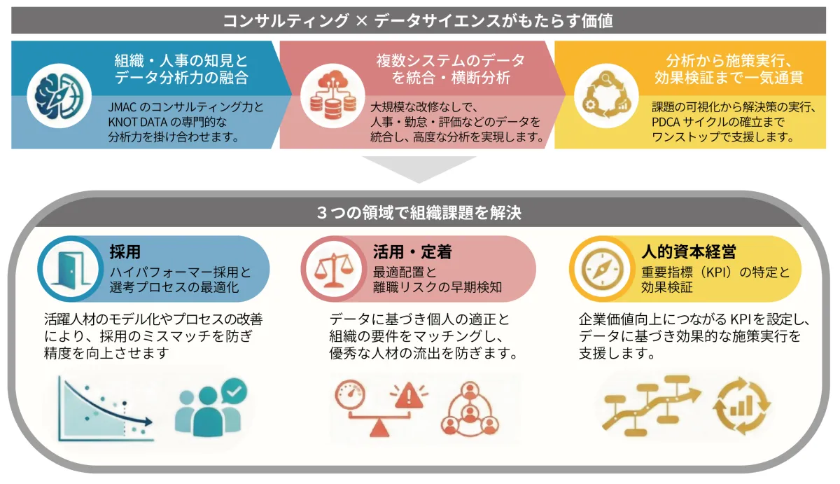JMAC’s extensive knowledge of organizational and HR consulting, combined with KNOT DATA’s analytical prowess, ensures a robust approach to people analytics that is both practical and outcome-driven. The suite offers solutions that are not just theoretical but result in quantifiable improvements in organizational performance.