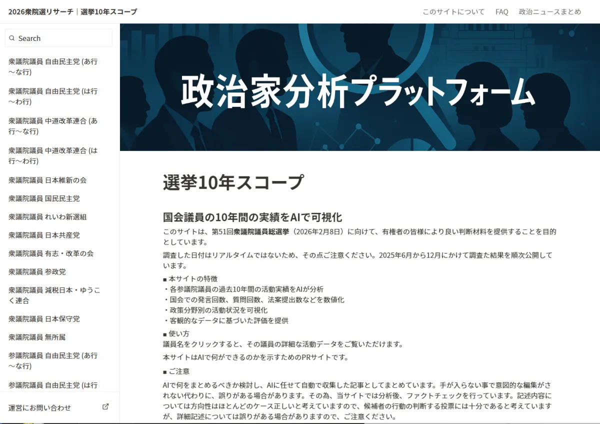 Election 10-Year Scope (https://www.10yes.jp/), seeks to provide essential information about candidates, comparing their activities over the past decade using advanced AI technologies.