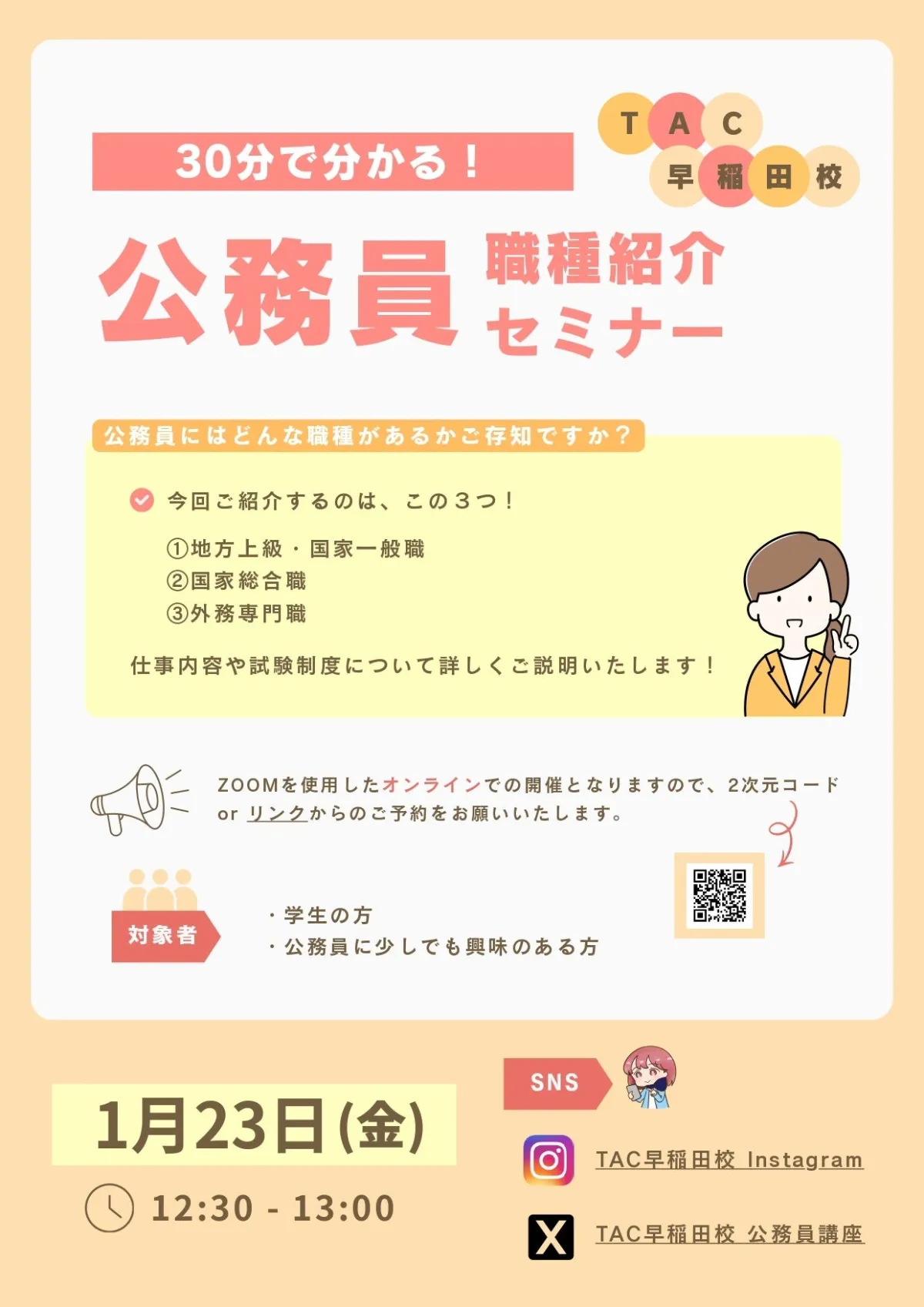 Are you curious about the different career options available in public service? On January 23, 2026, from 12:30 PM to 1:00 PM, TAC Waseda School is hosting an online seminar titled "Understanding Public Service Job Types in 30 Minutes!" This event will cover three primary career types in the public sector: