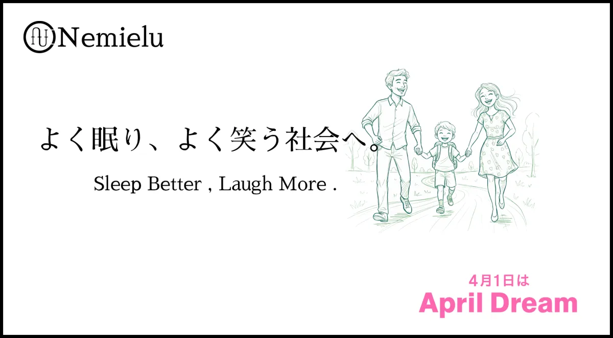 Mitsuhiro Matsumoto, Nemielu aims to foster a society that emphasizes the importance of sleep and laughter. The company's motto, "For a society where we sleep well and laugh often," encapsulates its mission to tackle various societal challenges related to inadequate sleep.