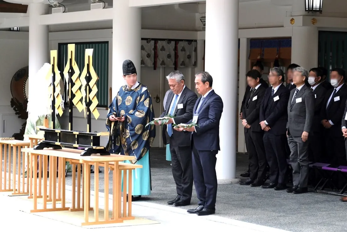 In the Central Branch, the safety prayer ritual was conducted at Asahi Shrine in Nagoya, followed by a networking meeting at the TKP Nagoya Sakae Conference Center. A total of 58 participants from 21 different companies attended the event, which featured representatives from Japan Property Management offering prayers for a safe and healthy year ahead. During the networking meeting, Takada Yasuyuki, a senior executive officer, delivered opening remarks emphasizing the importance of safety initiatives and encouraging a renewed commitment to accident prevention among attendees.