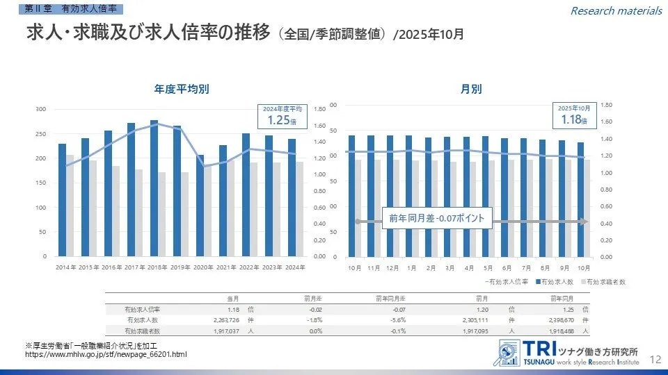 The Tsunagu Institute of Work Styles, a research organization under Tsunagu Group Holdings, has released its latest report summarizing key trends in Japan's job market based on data published by governmental agencies. This report focuses on the job openings-to-applicants ratio, unemployment rates, and new job postings for October 2025.