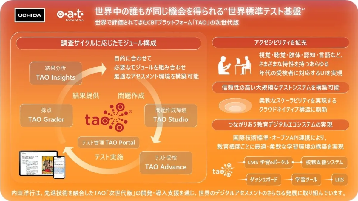 This next-generation 'TAO' maintains the original ethos and reliability while developing a platform that allows learners from various backgrounds to be evaluated on equal footing, regardless of location, language, or circumstance. With growing demands for more robust features due to technological advancements, Uchida Yoko and OAT are prepared to face challenges posed by larger-scale assessments, enhanced accessibility, and a more integrated digital education ecosystem. Notably, OAT is now part of Uchida Yoko's group as of 2023 to streamline the development process.