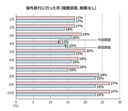 Most travelers ventured abroad during September and October, with both months recording 27% of travel. This trend highlighted a shift, indicating that many people are opting for late summer trips, avoiding the peak prices associated with the Obon holiday season.