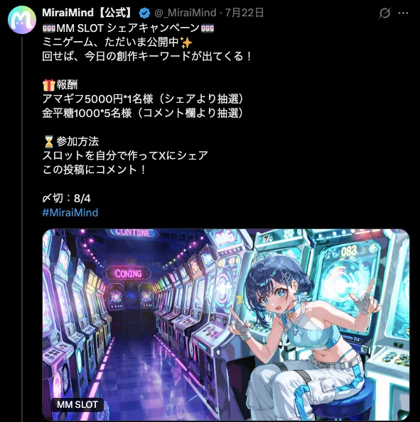MiraiMind aims to integrate AI characters with the outcomes of the slots, which would further enhance user interaction and engagement. Future plans include social media-linked events designed to bring users together through their shared love of creativity and entertainment. The team at