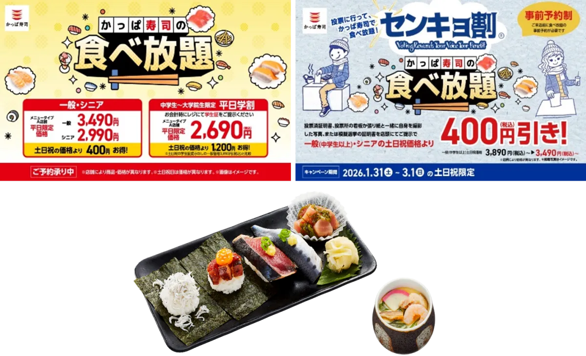 From January 31 (Saturday) to March 1 (Sunday), Kappa Sushi is providing a special “Senkyo Discount,” which allows eligible customers and their accompanying guests to enjoy a discounted all-you-can-eat rate on weekends. This offer adds another level of excitement for patrons during this limited-time event.