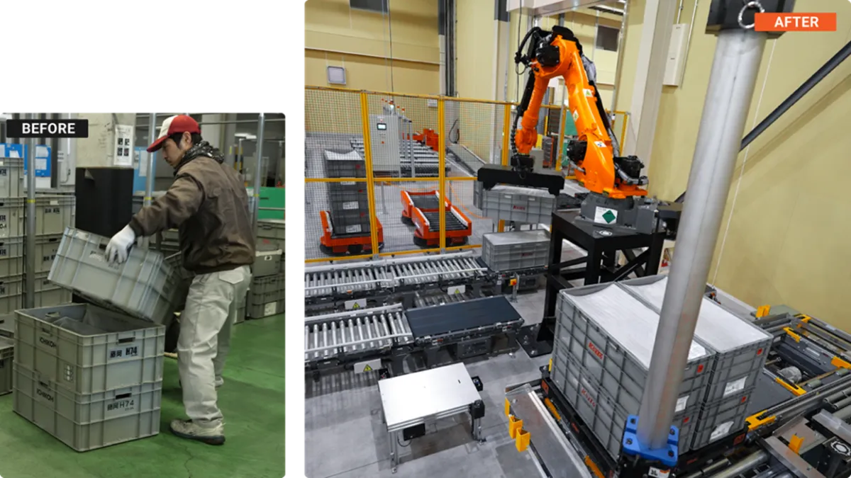 Using intelligent robots combined with AGVs, Nippon Unyu has achieved automatic replenishment for 97 different product types. The robots handle the depalletizing and palletizing of returnable containers and show remarkable versatility, managing everything from precise alignment in the millimeter range to accommodating a mix of sizes in returnable boxes. This precision facilitates the stacking of products, after which AGVs seamlessly transport them, automating the entire process from replenishment to empty container collection.
