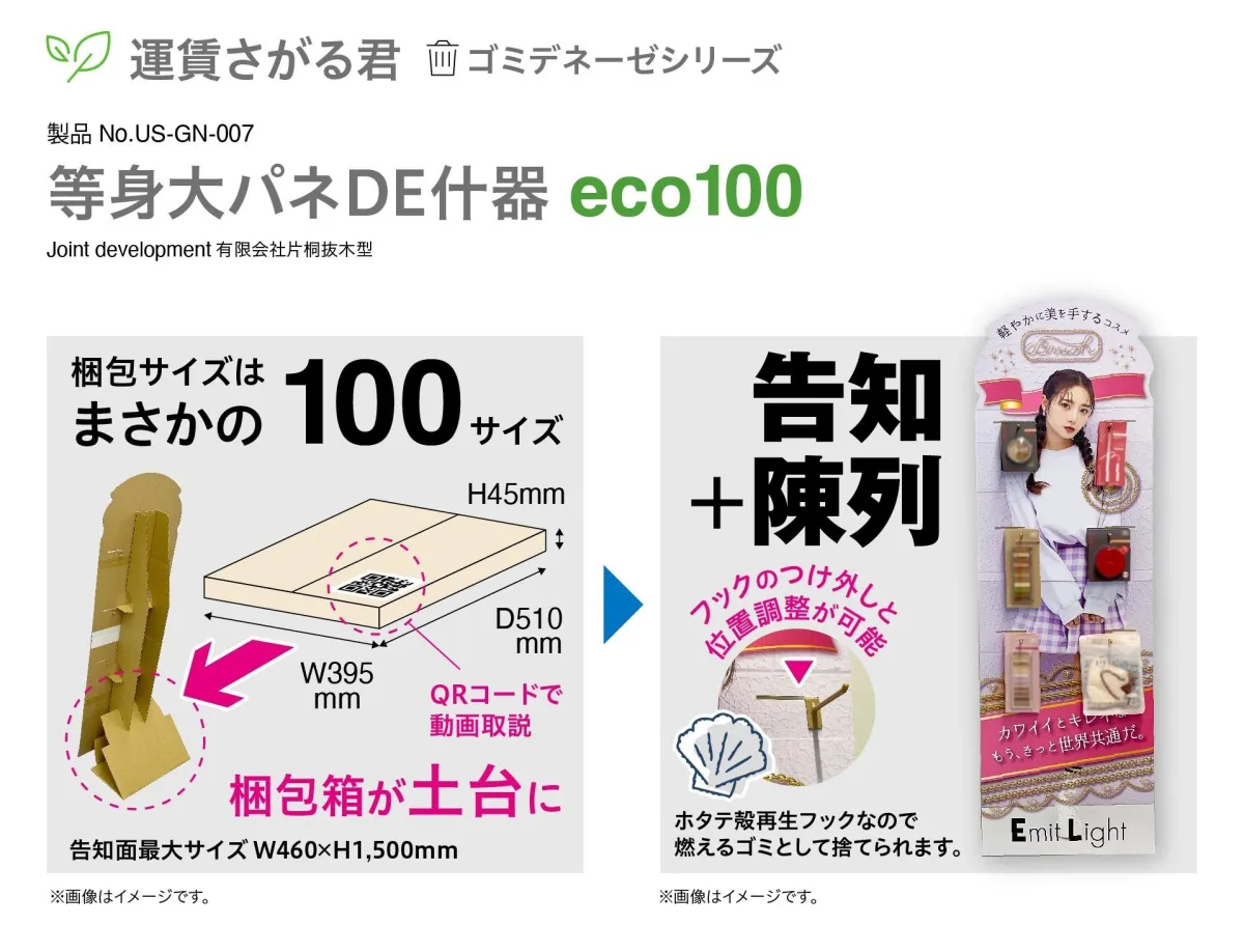 The 'Life-Size Panel DE Display eco100' is distinctively constructed using a foldable design, which reduces its packaging size to a mere 100 size, thereby cutting down shipping costs and enhancing storage efficiency. Thanks to its lightweight and space-saving characteristics, this display system alleviates the burden of layout changes and preparations at retail locations. One of its standout features is its eco-friendly design; the packaging can be reused as support legs, ensuring zero wastage upon setup, a requirement that resonates in today's environmentally conscious market.