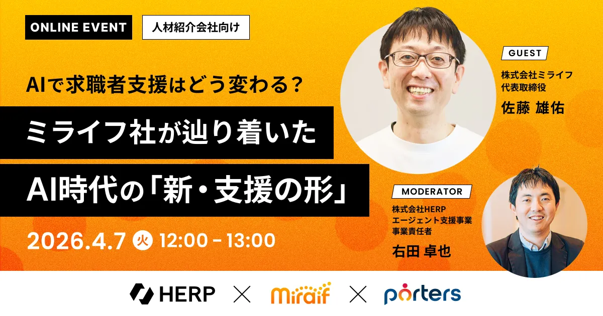 Porters Inc., located in Minato-ku, Tokyo, is organizing a complimentary online seminar titled "How will AI change job seeker support? The 'new support model' discovered by Mirai Life" on April 7, 2026. This event features an in-depth interview with Yusuke Sato, the CEO of Mirai Life, aimed at shedding light on how they are redefining support for job seekers in the age of AI.