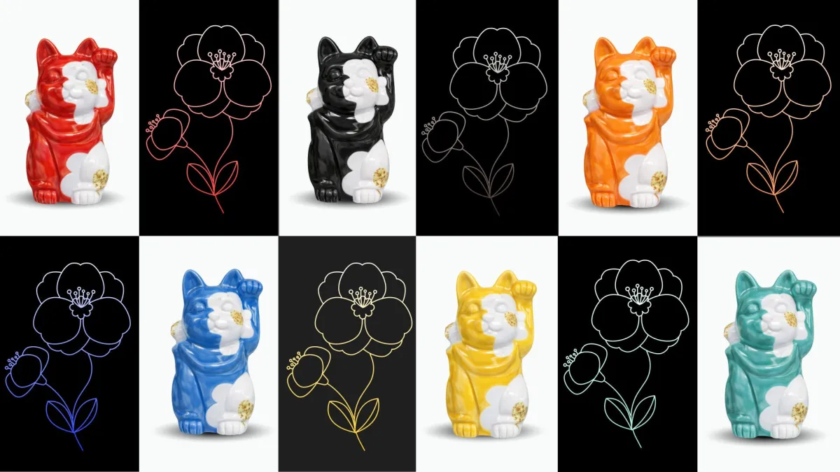 As part of this collection, the inaugural artwork titled 'ART MANEKI TSUBAKI' aims to redefine the lucky cat concept within a contemporary context. Collaboratively developed through dialogues with master craftsmen, this piece embodies a mutual respect for traditional heritage while embracing modern values.