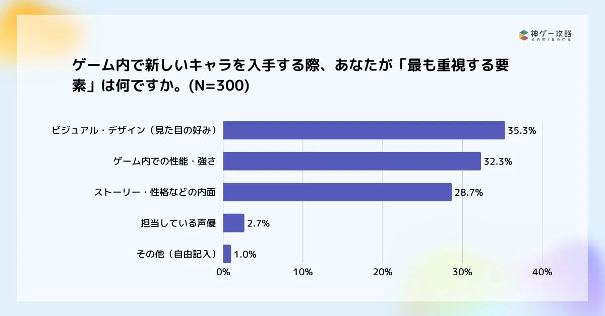 - - Visual Aesthetics Matter: The preference for visual appeal at 35.3% underscores the importance of design elements in character selection, showing that players value their favorite characters' looks.