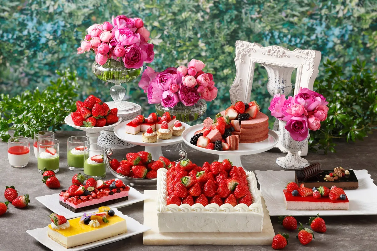 The dessert buffet doesn't skimp on variety either; it features a delightful assortment of beautifully crafted strawberry treats, including strawberry shortcake overflowing with fresh strawberries, and a unique strawberry baumkuchen, giving diners a chance to sample various strawberry-infused delicacies.