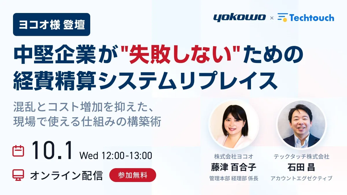 During the webinar, attendees will gain insights from Yokowo's real-world experience with their expense reimbursement system replacement project. The thematic emphasis will be on achieving a “failure-free” system replacement. This event is must-attend for leaders responsible for digital transformation (DX), finance department heads, and anyone interested in learning successful strategies from other companies’ experiences. Don't miss out—register today!