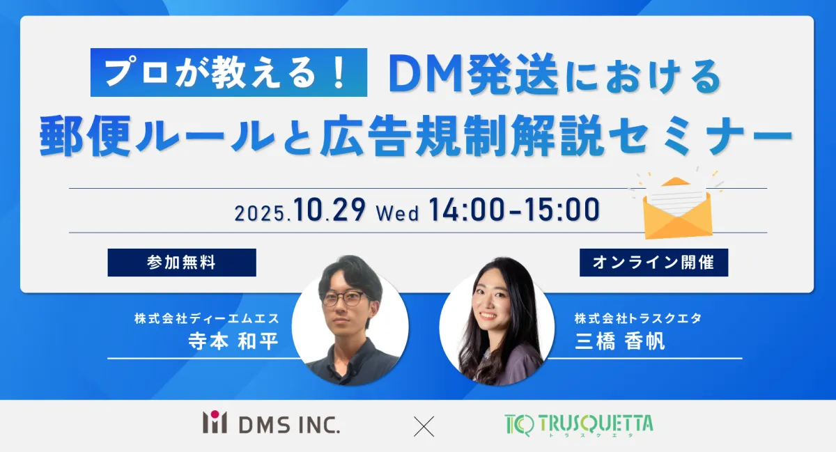 'Expert Insights into Postal Rules and Advertising Regulations for DM Delivery' will be organized by Trusquetta Inc., a company specializing in advertising expression check tools. This event is co-hosted with DMS Co., a leader in direct mail services, boasting an impressive track record of over 350 million DM shipments annually.