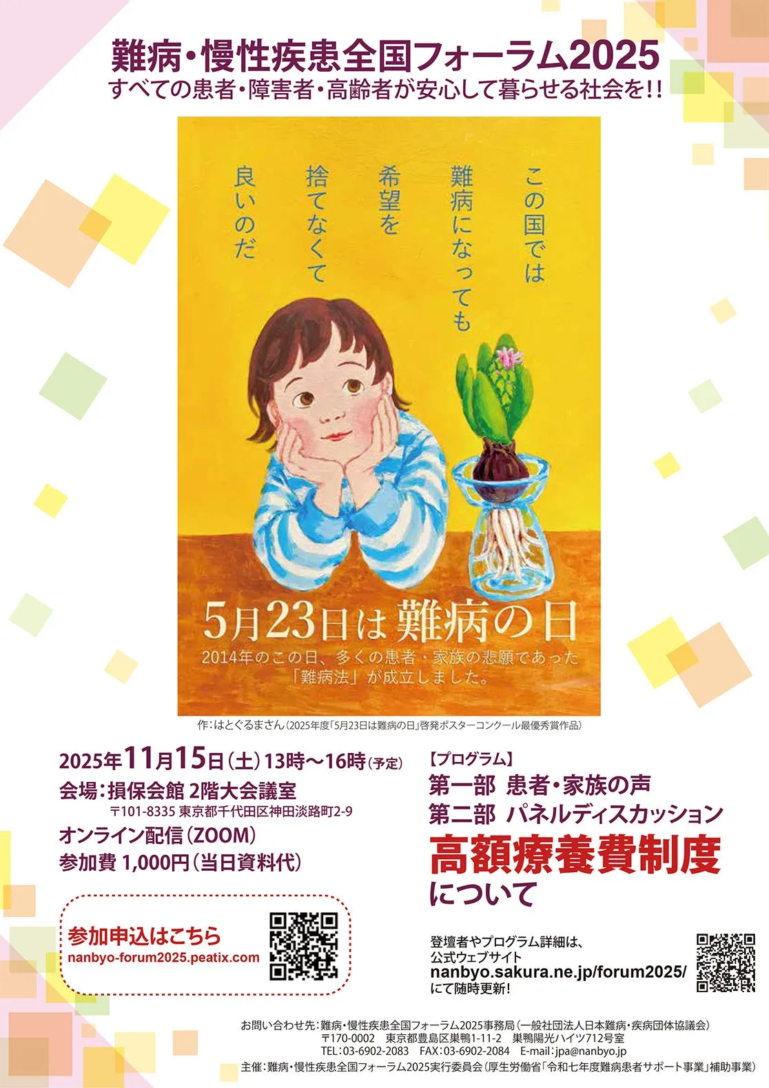 On November 15, 2025, the Nationwide Forum for Severe and Chronic Illnesses will take place, hosted by the Japan Patient Association (JPA) along with other partner organizations. This significant event aims to bring attention to the experiences of patients living with difficult diseases, promoting a community where all individuals can feel secure. The forum will be conducted in a hybrid format, allowing attendees to participate either in-person at the Sompo Hall in Chiyoda, Tokyo, or online via Zoom.