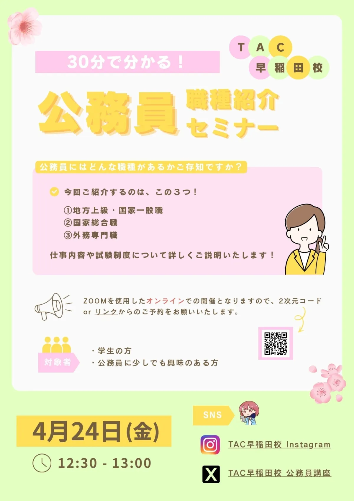 Are you considering a career in public service? TAC Corporation, a prominent educational service provider based in Chiyoda, Tokyo, is here to assist you in discovering the diverse opportunities available within this esteemed sector. On April 24, 2026, from 12:30 PM to 1:00 PM, we will host a free online seminar titled "Understanding Public Service Roles in 30 Minutes".