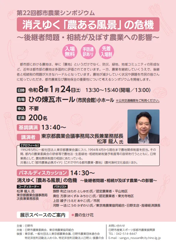On January 24, the 22nd Urban Agriculture Symposium will take place at the Hino Brick Hall, focusing on the critical issues surrounding urban agriculture, specifically the challenges posed by the declining agricultural landscapes in urban areas. This year's theme, "The Crisis of Disappearing Agricultural Landscapes: The Impact of Heirloom and Succession Issues on Agriculture," seeks to address the pressing need for awareness and strategies to combat the decline of urban farming.