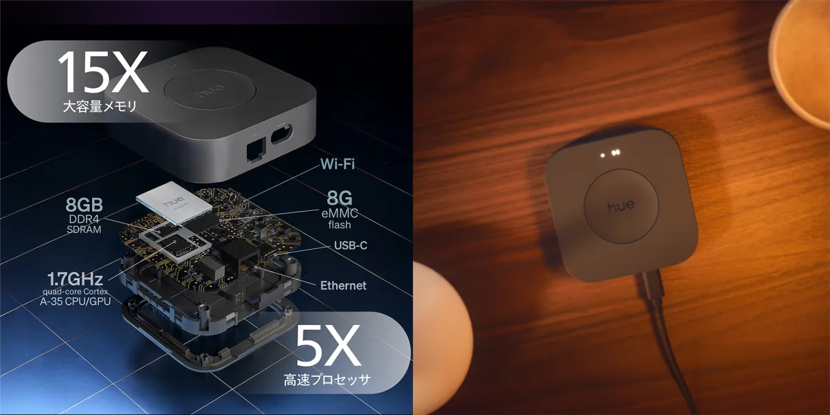 MotionAware™, allowing Hue lights to function as motion sensors. The bridge can now connect up to 150 Hue lights and 50 accessories, enhancing user flexibility significantly. New connection options include both LAN and Wi-Fi, eliminating the need for wiring in some cases. Additionally, the security has been fortified against unauthorized access through a new Zigbee Trust Center, ensuring a more secure smart home environment. Plans are also in the pipeline to integrate AI capability for further enhancements.