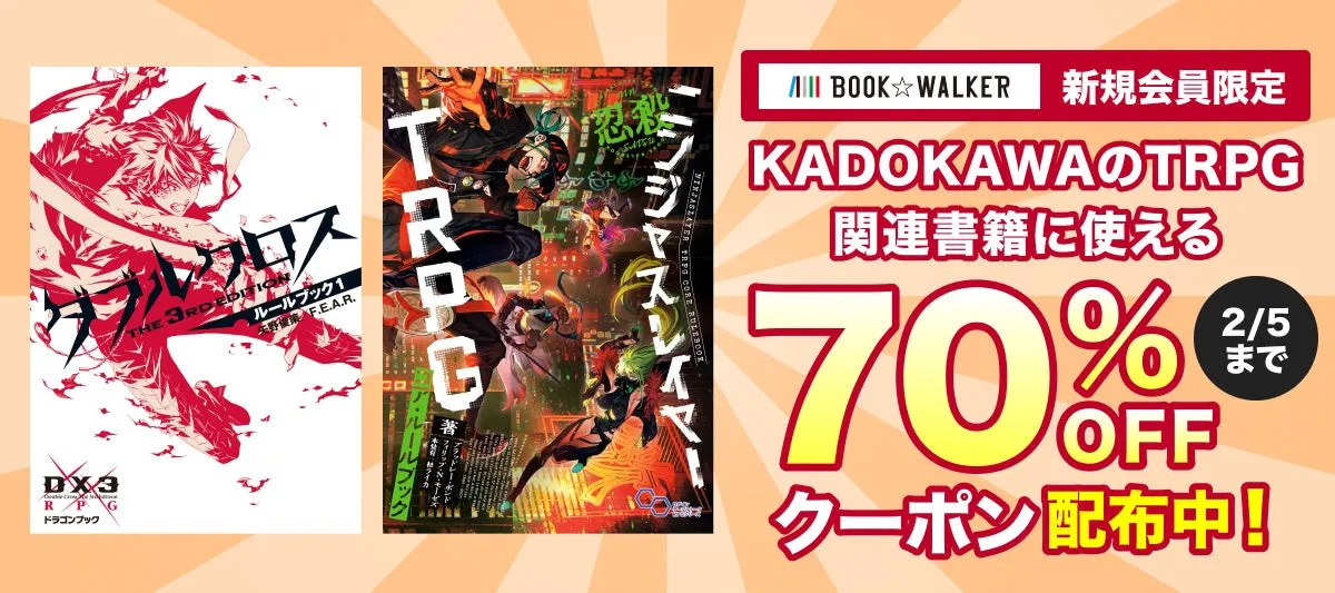 - - Offer: A coupon granting 70% off on selected KADOKAWA TRPG books (maximum discount cap of 3000 yen).