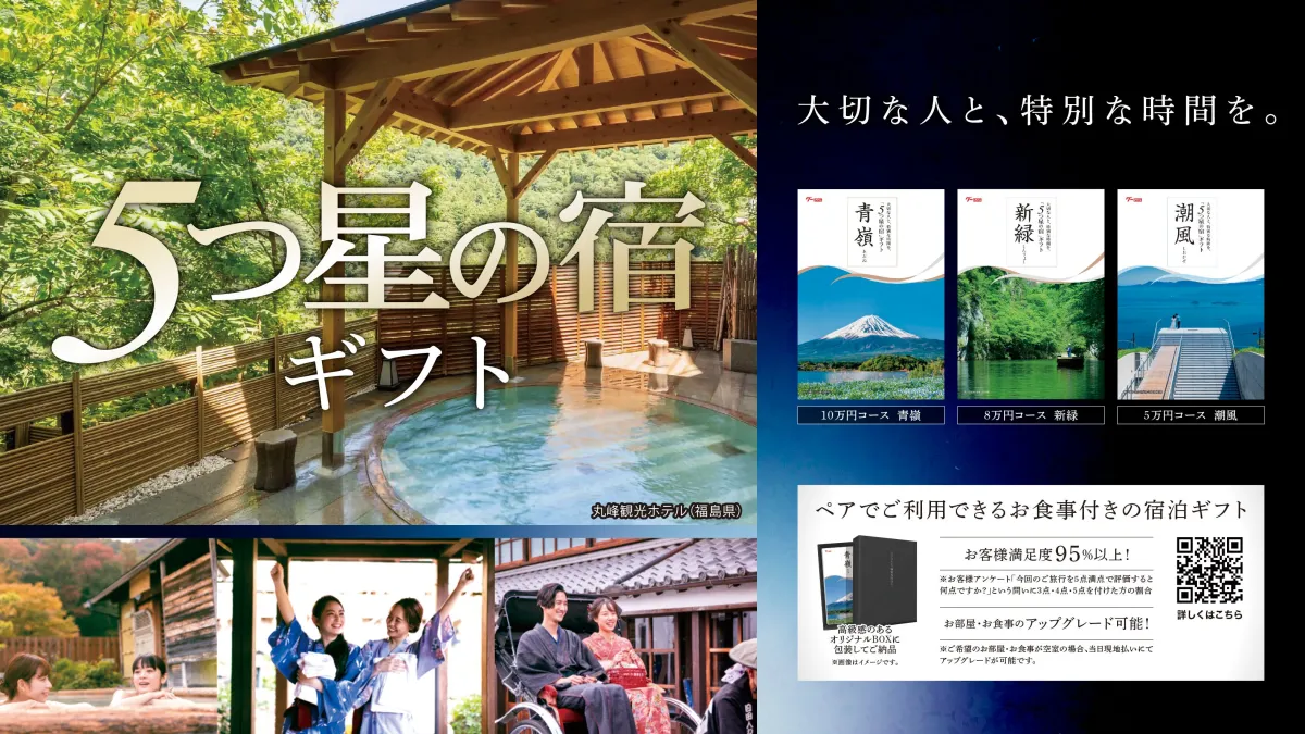 The '5-Star Inn Gifts' catalog will exclusively showcase hot spring inns that have received certification from the Tourism Economics Newspaper Company, a subsidiary of Proto Corporation. The inns featured in the catalog have achieved the prestigious '5-Star Inn' designation based on specific criteria evaluated by professionals in the travel industry. The catalog will offer three different course options priced at 50,000, 80,000, and 100,000 yen, each designed for two guests and inclusive of a one-night stay with meals.