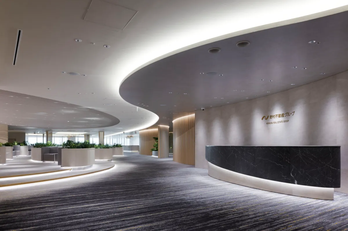 Nomura Real Estate Group relocated its headquarters to the newly developed BLUE FRONT SHIBAURA TOWER S to strengthen collaboration among its affiliated companies. Previously, their offices were spread across multiple floors, which presented challenges in communication. The move aimed not only at physical consolidation but also at enhancing the visitor reception experience by fostering a warm, welcoming environment that reflects the group's values. The group aspired to create meaningful experiences that resonate with visitors, elevating their interest and anticipation towards the Nomura brand.