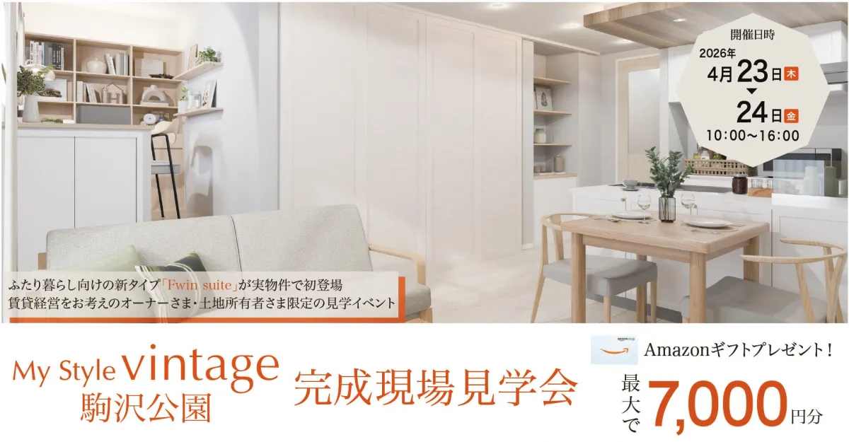 Cel Corporation. On April 23 and 24, 2026, from 10:00 AM to 4:00 PM, we invite prospective landlords and anyone interested in maximizing land use to visit our completed apartment located just a 5-minute walk from Komazawa University Station on the Tokyu Den-en-toshi Line.