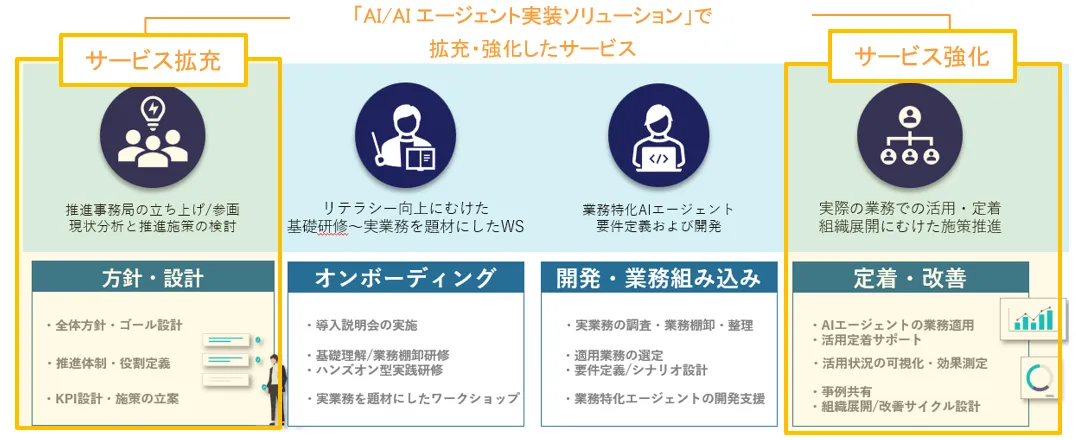 Since its launch in January 2024, the AI/AI agent implementation solution has expanded on Persol's earlier offering, the Generative AI Utilization Consulting Service. This updated solution goes beyond conventional consulting by actively assisting organizations in crafting strategic visions for AI usage, carrying through to practical application and reinforcement of AI agents, such as Microsoft 365 Copilot.