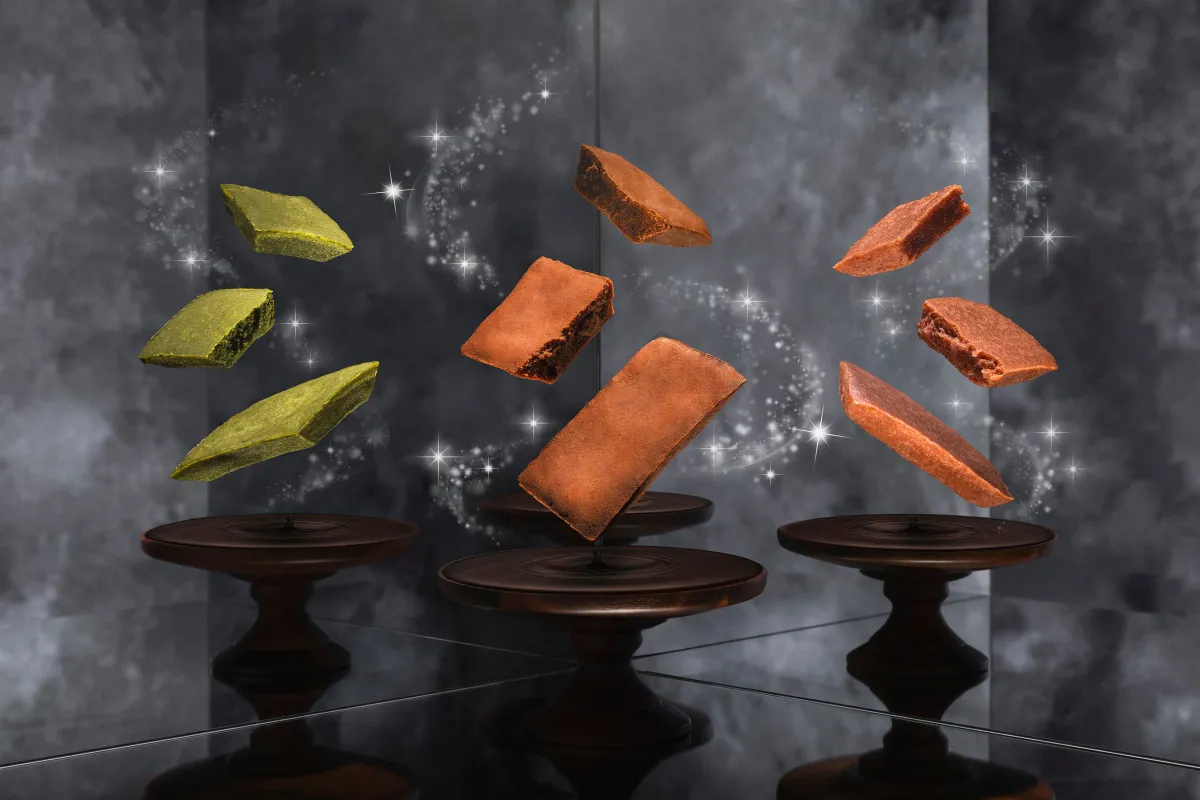 Tenku no Matcha®: The second flavor, Tenku no Matcha®, is crafted from high-quality green tea leaves grown in the lush mountain region of Shizuoka. Here, the blend of first-pick and second-pick tea leaves creates a balanced bitterness and sweetness. Paired with white chocolate and a creamy texture, this brownie embodies the true essence of matcha enthusiasts.