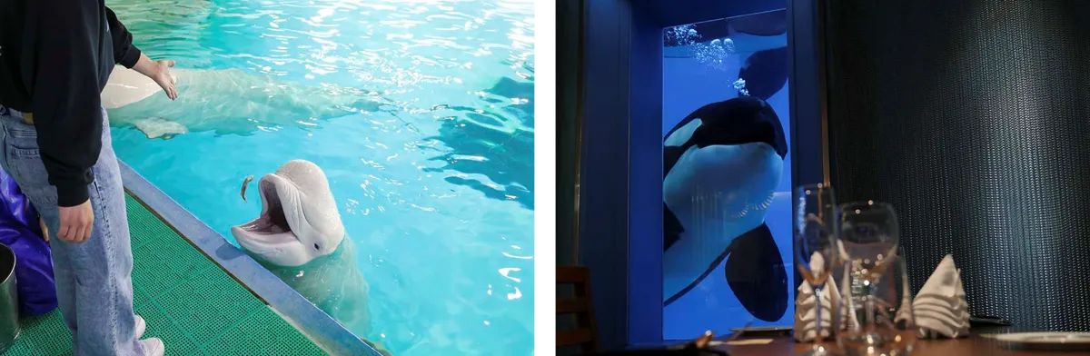 Fine Dining Experience: A carefully curated menu awaits at 'Ocean' restaurant, providing a blend of main dishes and buffet selections, all while enjoying the company of the orcas who visit in front of the viewing windows.