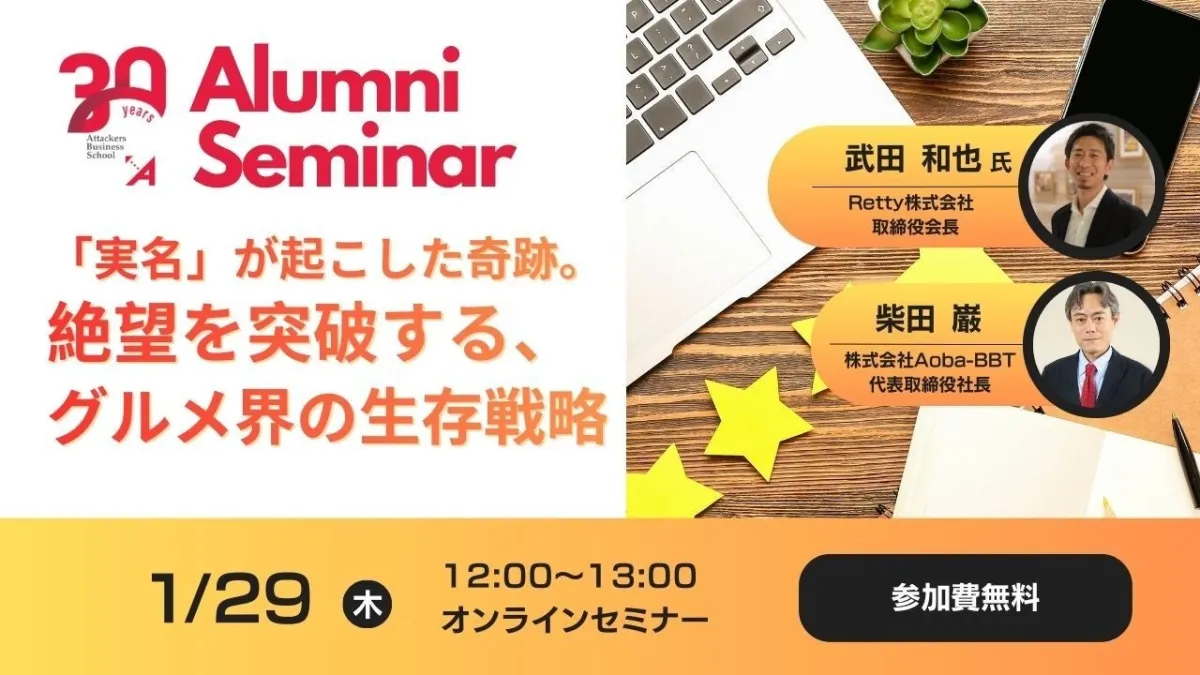 In celebration of the 30th anniversary of Aoba-BBT, the Attackers Business School (ABS), we are excited to announce a special online seminar featuring Kazaya Takeda, the founder of the real-name gourmet service Retty. This event is not just about sharing success stories; it dives deep into the strategies that propelled Retty to success in a market dominated by anonymous reviews.