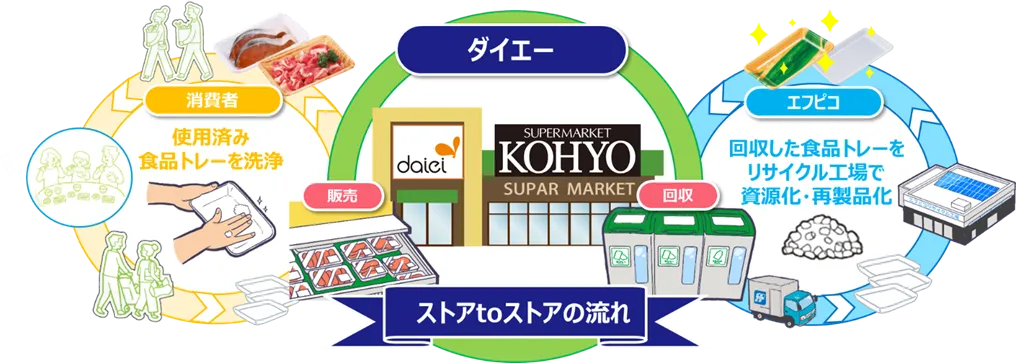 F-Pico and Daiei are dedicated to becoming eco-leaders in their regions. Customers can bring used food trays to Daiei stores, where they will be collected for recycling. These trays will subsequently be transformed into eco-friendly products, including eco-trays and eco-oriented packaging materials. This 'Store to Store' system creates a sustainable cycle connecting stores that collect used items with those that sell recycled eco-products. Both companies aspire to enhance and expand this collaborative effort with customers, contributing positively to environmental resource management and CO2 emission reduction.