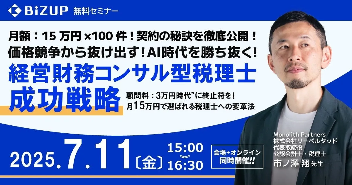 “Breaking Free from Price Competition! Winning Strategies for Tax Professionals in the AI Era.” This event is organized by Nippon Bizup Co., Ltd., and will cover essential insights on how tax advisors can evolve amidst the growing influence of AI and changing market demands.