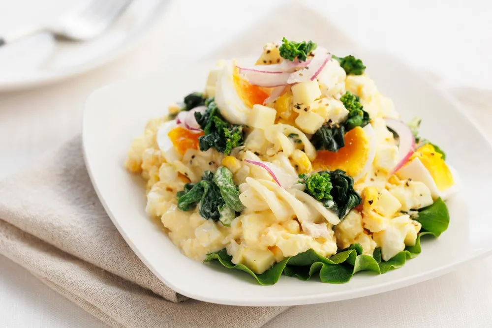 This exquisite salad combines creamy soft-boiled eggs with the unique slightly bitter taste of nanohana, all brought together with a specially crafted cheese tartar sauce. The salad uses fusilli pasta, which holds the sauce beautifully, alongside the rich flavor of tuna and a hint of curry for an exciting twist. The added crunch from pickled cucumbers and onions introduces a refreshing acidity, making each bite a balanced experience.