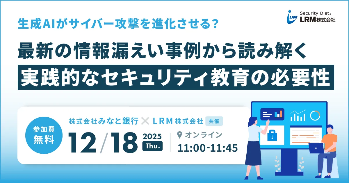 LRM Corporation, headquartered in Kobe, Hyogo, and Minato Bank, based in Chuo-ku, Kobe, are co-hosting a free seminar entitled "Does Generative AI Evolve Cyber Attacks? The Need for Practical Security Education as Illustrated by Recent Data Breaches". This event will take place online via Zoom on Thursday, December 18, 2025, from 11:00 AM to 11:45 AM. Participants can join easily from the comfort of their homes.