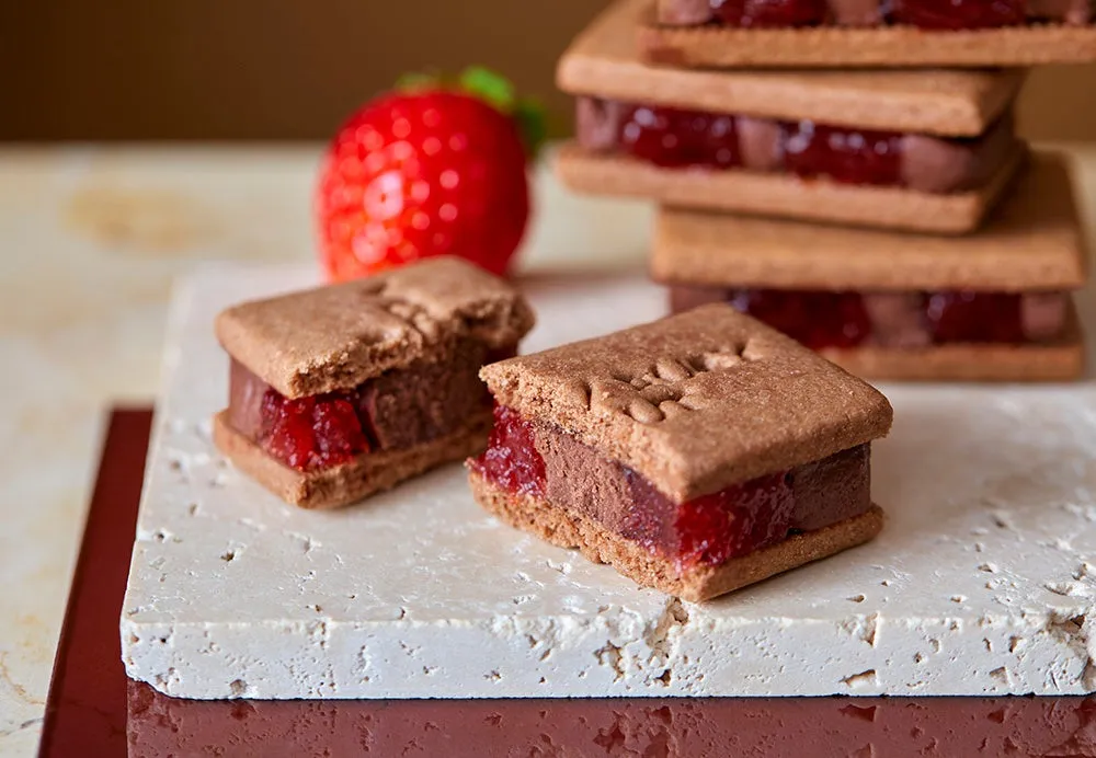 The highlight of this season is undoubtedly the Strawberry Cocoa Sandwich, launching just in time for the winter festivities. This seasonal sandwich features a luxurious filling made from Italian Sabrina strawberries, cooked down into a luscious confiture that delivers a burst of sweet flavor. Combined with the robust richness of cocoa chocolate, the filling is a true delight. The innovative ‘Double Melt’ production method ensures a joyful combination of soft textures that melt in your mouth, sandwiched between moist cocoa-flavored cookies.
