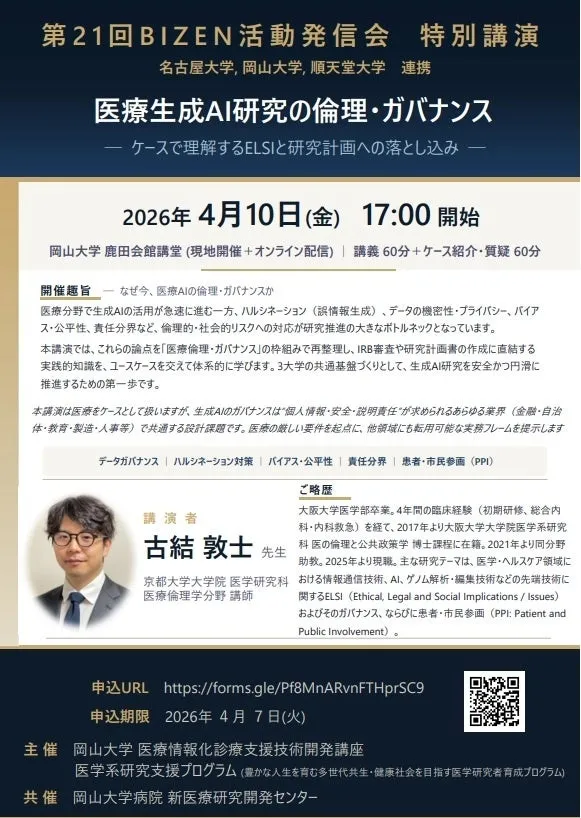 On April 10, 2026, Okayama University will host the 21st BIZEN Conference, focusing on ethical governance in medical generative AI. This hybrid event will allow participants to engage both in-person at Okayama University Hospital and online via Zoom.