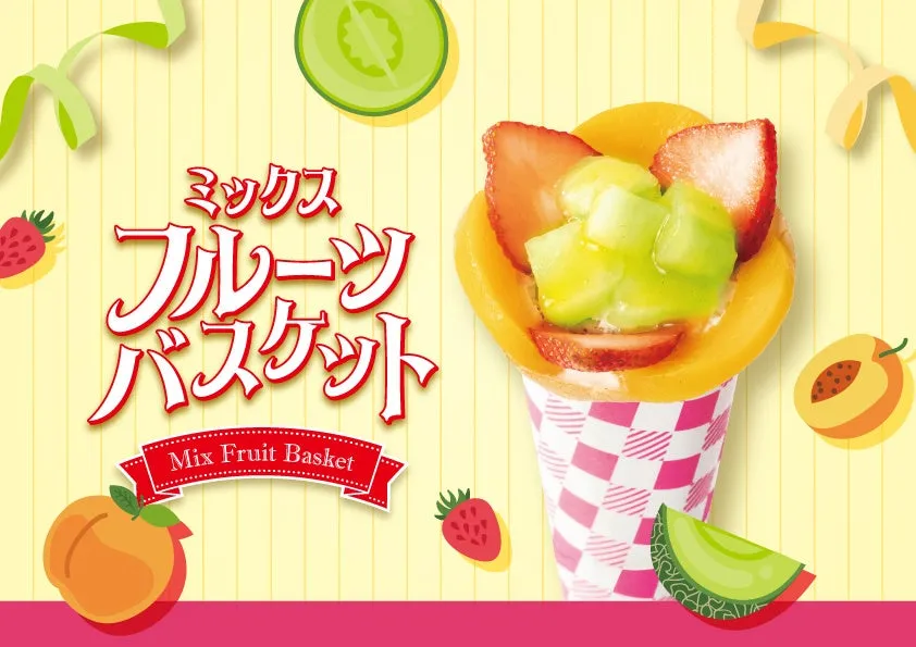 The highlight of this seasonal menu is the 'Mixed Fruit Basket' crepe, priced at 630 yen (tax included). This delightful creation features a generous assortment of yellow peaches, melons, and strawberries, all drizzled with sweet peach sauce and finished with a fluffy whip. Each bite promises a blend of various fruit flavors, ensuring a unique taste experience that never gets monotonous.