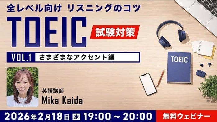 free online seminar titled "Listening Tips for All Levels: Diverse Accents Edition". This seminar is specifically designed for individuals preparing for the TOEIC Listening and Reading test (L&R).